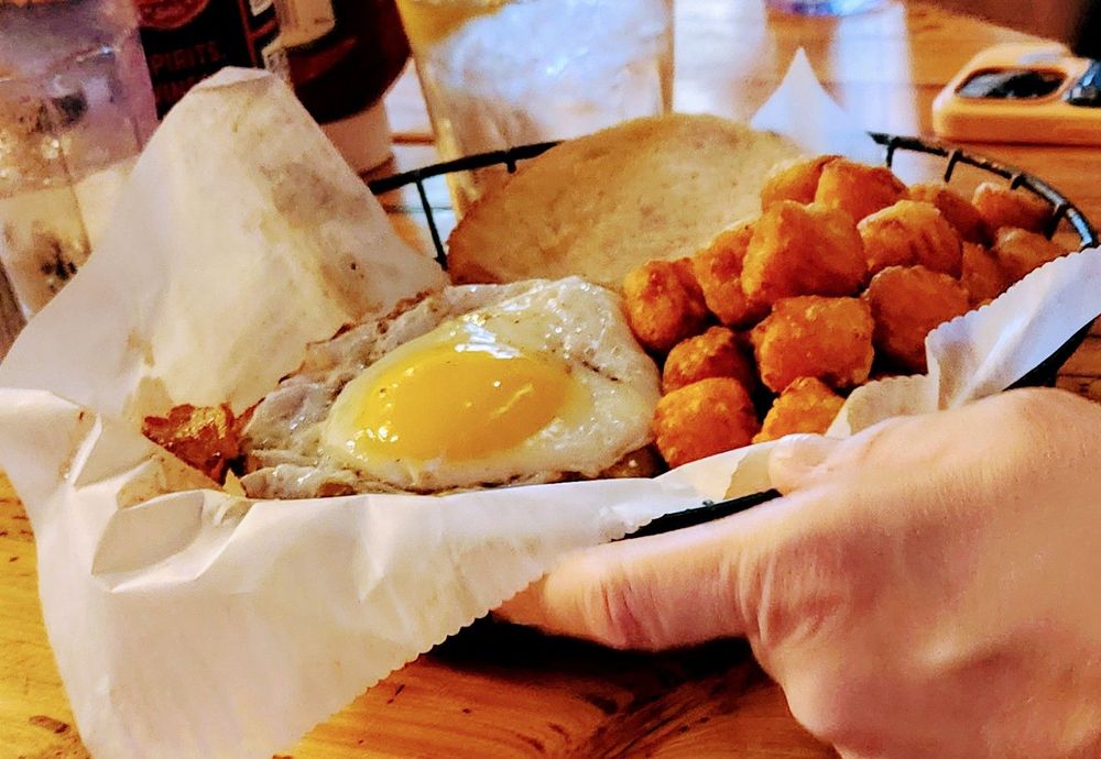 Celebrating our northern neighbors - crispy fries, white cheddar cheese curds, smoked pork, amber cream ale gravy topped with scallions and a sunny-side up egg